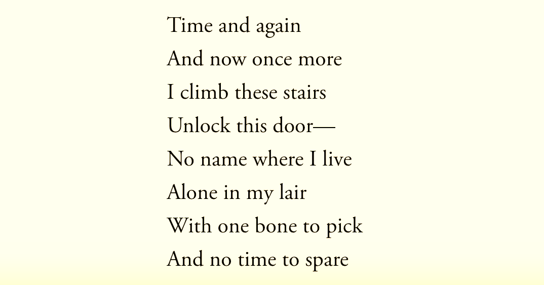 In a certain narrow sense, this doesn’t really rhyme, at least insofar as it doesn’t have full end-rhymes; in another sense, like all of Menashe’s poetry (and perhaps like all poetry), every part of this rhymes with every other part: whether vocally (e.g. thin and him) or visually (e.g. hones and one).