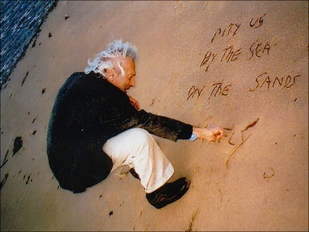 At fourteen lines, it is one of the longest poems in the New and Selected. When Menashe is known at all, he is known as a great miniaturist: one of the great miniaturists. Very few of the poems in the book are longer than a page; the majority (I’m guessing, from memory) are six or eight lines at the most; and some of them, like the untitled one that he is writing in the sands in the photo above, are mere words.