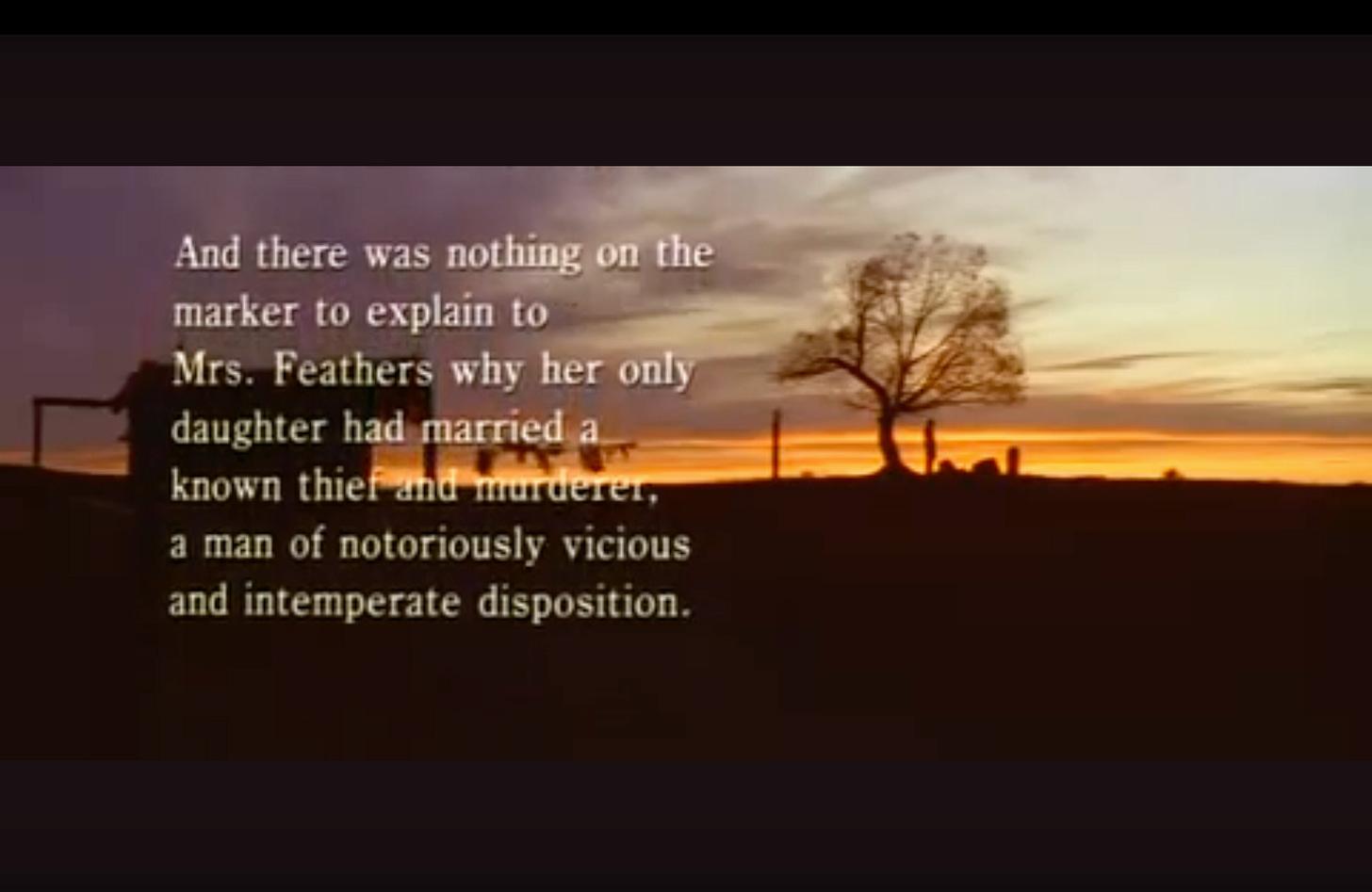 William Munny, out of Missouri. Drunken savage, ‘known thief’, ‘killer of women and children’… When we meet him, he has left that behind; he is widowed, broken, sober. ‘Your mother,’ he tells his children, ‘cured me of drink and wickedness.’